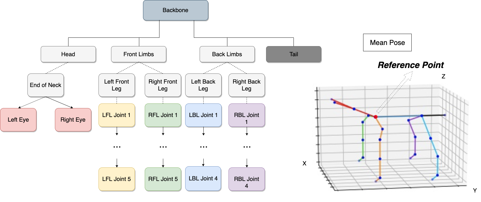 Our hierarchical model contains 23 joint points (some joints may be omitted depending on different species) and is shown in the following figure: